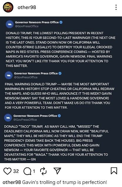 re Gavin Newsom in California doing redistricting, which is exactly what Greg Abbott is doing in Texas, at the request of the orange buffoon: