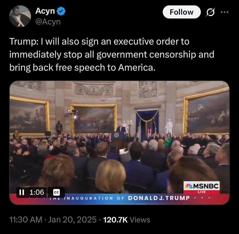Translation: “We must restore free speech rights for everyday MAGA Americans.”