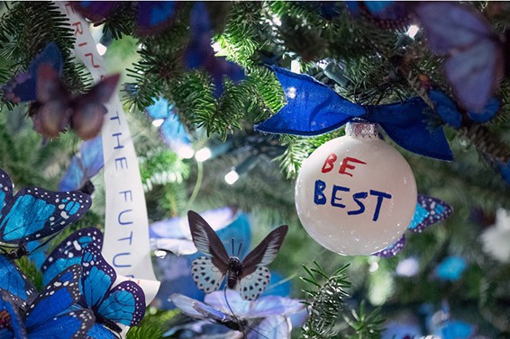 Blue butterflies accompany the “Be Best” ornaments.