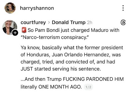 This is what irks me the most. I don't disagree that Maduro was an illegitimate leader (I understand that he rigged the last election in Venezuela so he would win), but what's next? Is the orange buffoon just going to storm into the next country of a leader he likes and take that over without getting the proper congressional approval (and usually against the will of most of the population), all in the name of "a threat to the US"?
