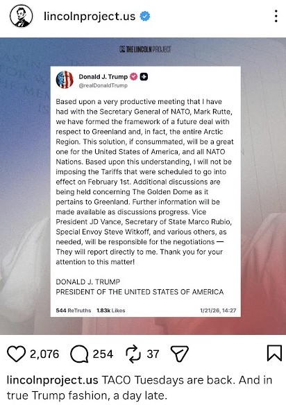 I think they will let him paraphrase one last time in Davos in a few hours. The French president has already left because he has more important things to do than listen to the storyteller. Incidentally, he threatened him in a private message with a 200% import duty on champagne and wine because he doesn't want to participate in the ‘Peace Board’. Germany also received an ‘invitation’ like yours 🙄.