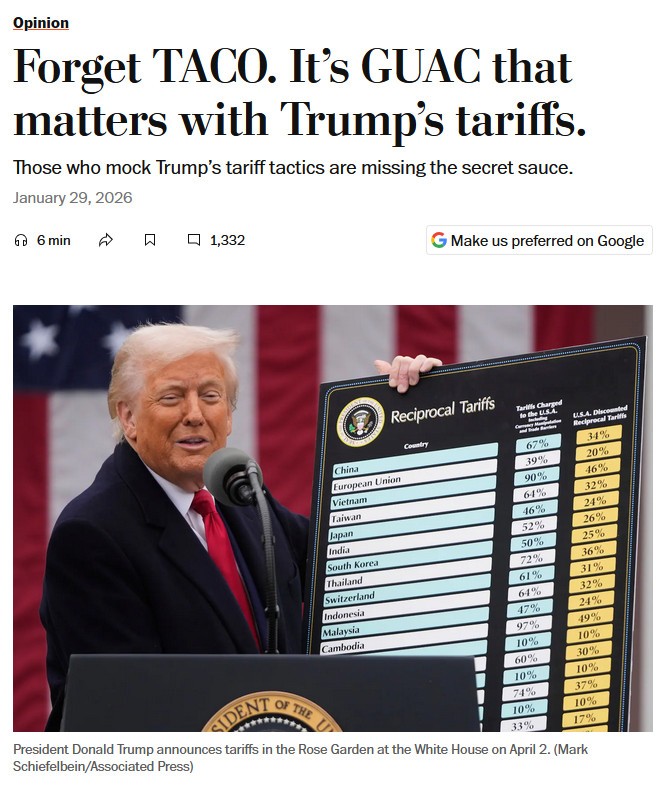 But all along, from Inauguration Day to Liberation Day to Davos, the president has been eating his favorite dish: TACO salad. And the unsung ingredient is GUAC. Donald Trump has been “gaining unmatched American clout” through his strategic use of economic pressure. ...