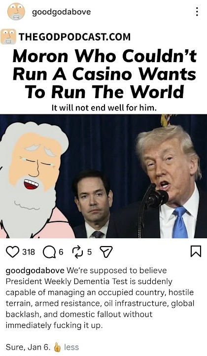 quickymart: I gotta hand it to the orange buffoon - having taken over Venezuela he now casts his eyes (again) towards Greenland. All this is a pretty good distraction from the Epstein Files!