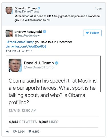 Checkout the racist things Ali said about whites. Strikes me as incredibly more racist than anything Drumpf has said.