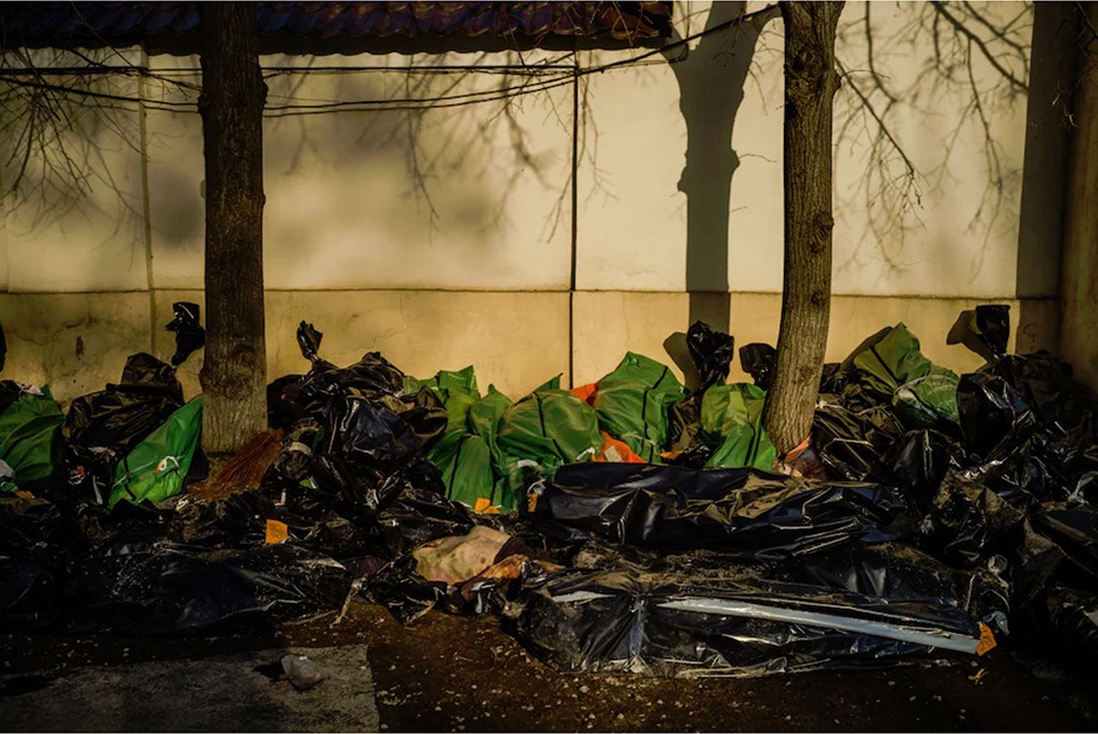 Bodies of killed civilians lie on the ground in front of the city morgue in Kharkiv, Ukraine, on March 16.