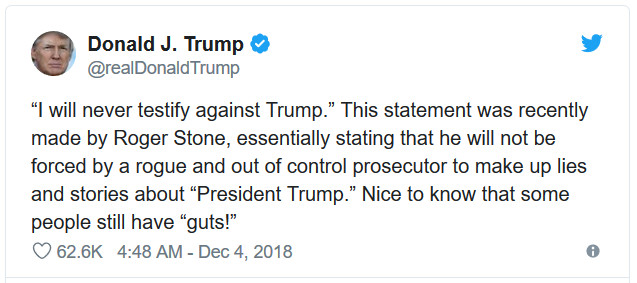 - President Trump’s praise for Roger Stone’s guts for vowing not to testify against President Trump.