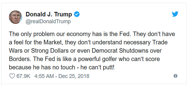 As the stock market closed out its worst December since 1931, the president placed sole blame for the staggering sell-off on the Federal Reserve, likening the central bank to a golfer who “can’t putt.”