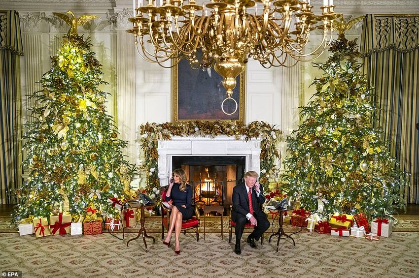 President Trump, who had not been seen in public since before the government closed Friday, appeared Monday evening with the first lady for an annual photo opportunity tracking Santa Claus on military radar. The couple sat in armchairs in the State Dining Room, where a fire was crackling and presents sat around two Christmas trees, and talked into separate phones to participate in NORAD Santa Tracker calls with children.