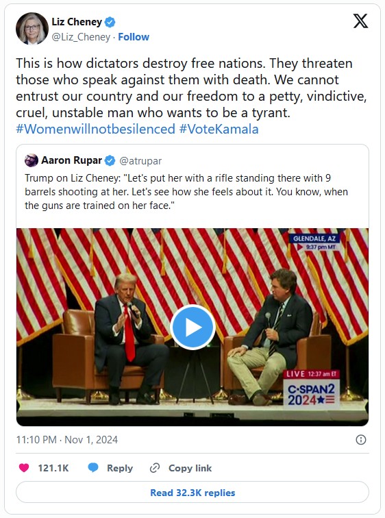 I realise this story is about the orange buffoon, but I think it's absolutely deplorable - actually, despicable - that he could say this about anybody; now he thinks Liz Cheney should be shot: