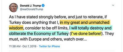 Donald Trump perhaps broke a record for aggrandizement on Monday, when he referred to his “great and unmatched wisdom” following his decision to withdraw US troops from northern Syria. ...