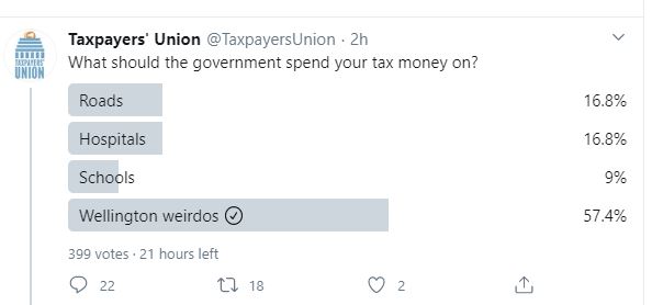 ROFL. Taxpayers union running a poll on Twitter. Obviously "Wellington Weirdos" is winning so far (screenshot of results as of now, 21 hours before end of poll):