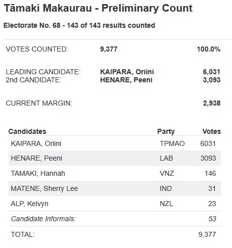 Congratulations to Oriini Kaipara - although I'm quite astonished to see that Kelvyn Alp, of all people (read: racist, white supremacist moron), somehow managed to get 23 votes in a Maori electorate?!?