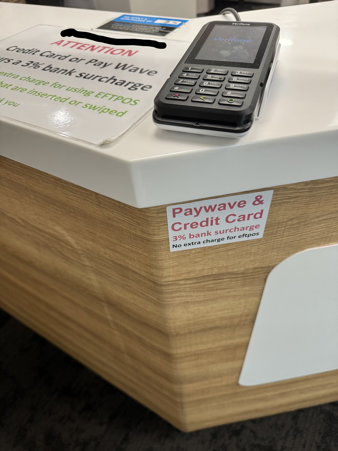 It seems that the 3% credit card fee, even before the Retail Payment System Act 2022 was introduced, was still on the very-high end of credit card fees. Since the legislation introduced a cap on credit card and paywave fees, the recommendation for providers is to either go based on a weighted-average cost, or some other reasonable calculation to cover the cost of providing these payment methods- but I can't see where this falls within that guidance. Every other retailer I've been to in memorable history has not been beyond 2.5%, and even that is on the high side.