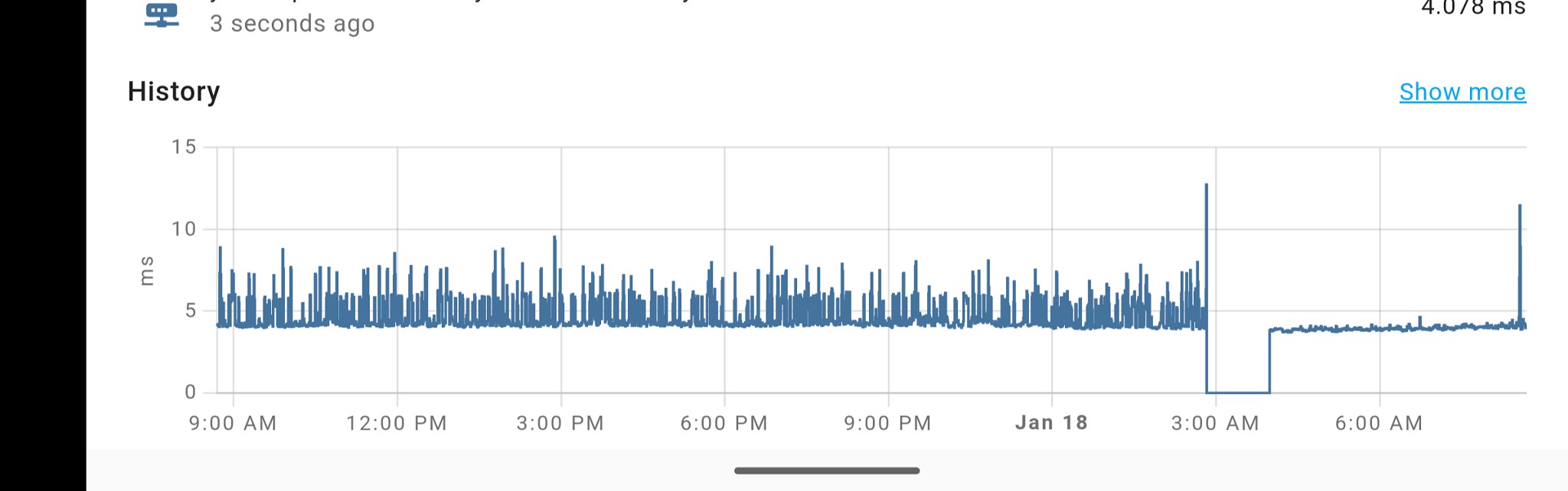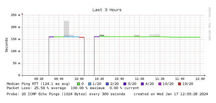 My smokeping results to California over last three hours - can see I was offline a couple of times in the night but now looking A-OK. π