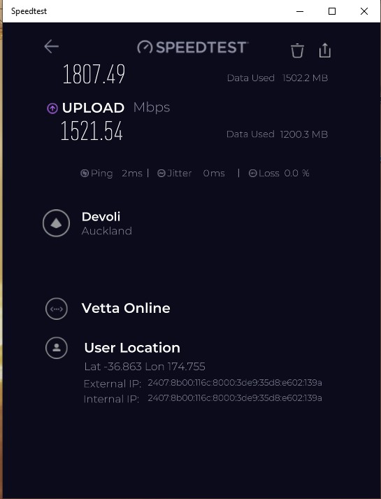 Under Orcon my previous ISP, I had a different speed constraint where downloads were around 1.2-1.5 Gbps but uploads were consistently 2.0 Gbps. Same router, home network etc.