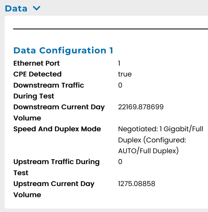 The data section shows that port 1 has negiotiated at 1Gbps full duplex (the cable is probably good on port 1).