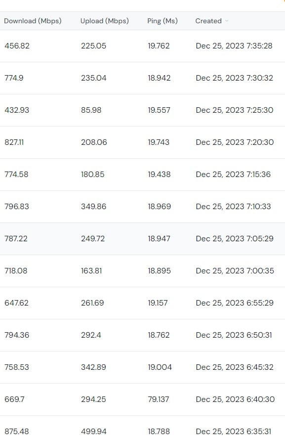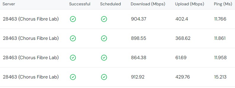 I have been doing speed test to the same server since I started with quic. One moment I'm getting 900up and just under 400 down on their 900/400 plan but then it is as little as 135/56. Attached is the latest test. Is anyone else having this sort of service problem?