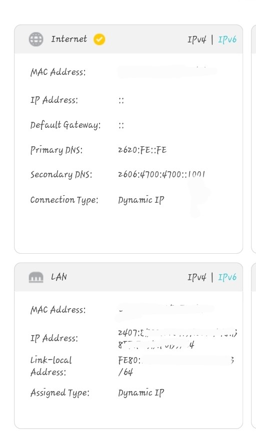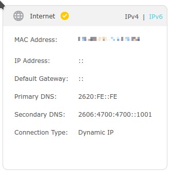 My Internet status for v6 showing no gateway or address: