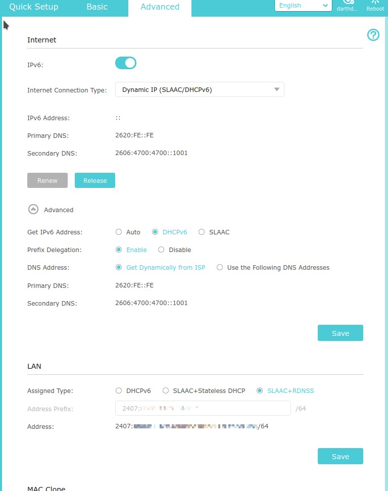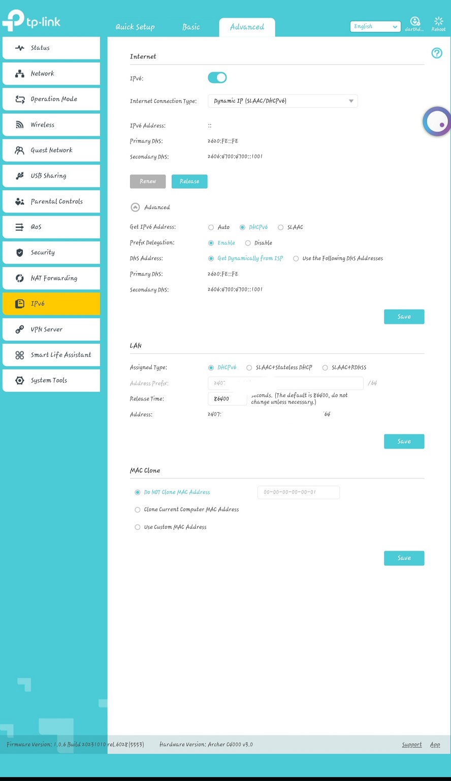 However I noticed in the IPv6 settings options I can't change the subnet to a /56 it only has /64 listed and no way to change this, DHCPv6, SLAAC+Stateless DHCP, SLAAC+RDNSS are all /64 in the LAN section with no way to change this. Is this what's preventing me from using v6 on this router?