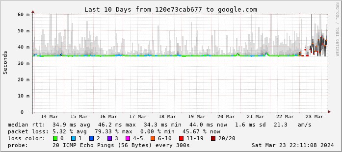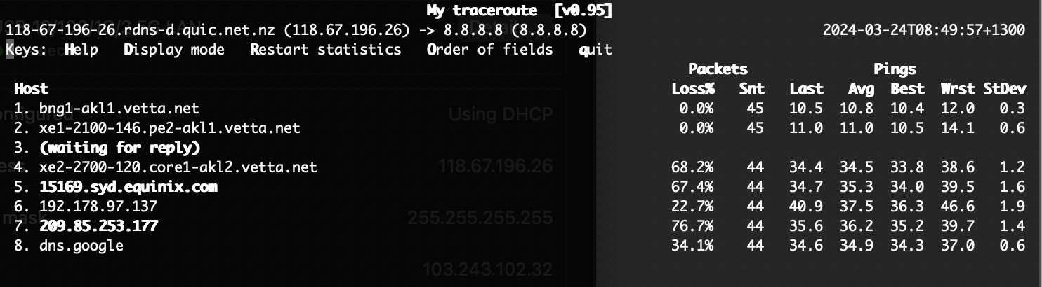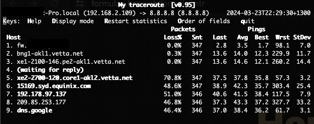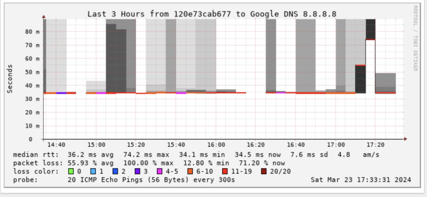 Is anyone having any packet loss issues out to 8.8.8.8? For anyone running smokeping already be good to compare notes. Also, can you all resolve against 103.250.90.8? one of the DHCP offered DNS resolver. I can resolve fine against the second: 202.179.141.8 but not the first directly from the pfsense box.