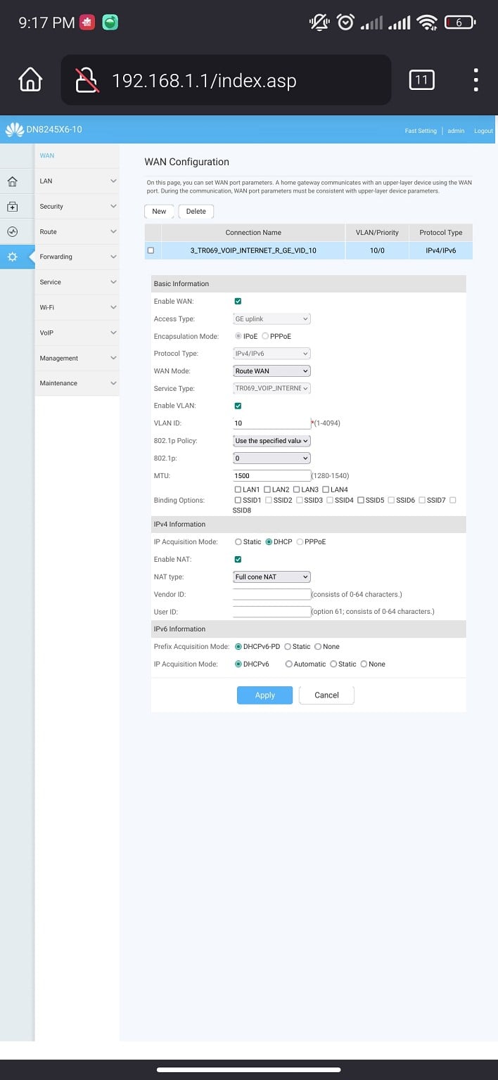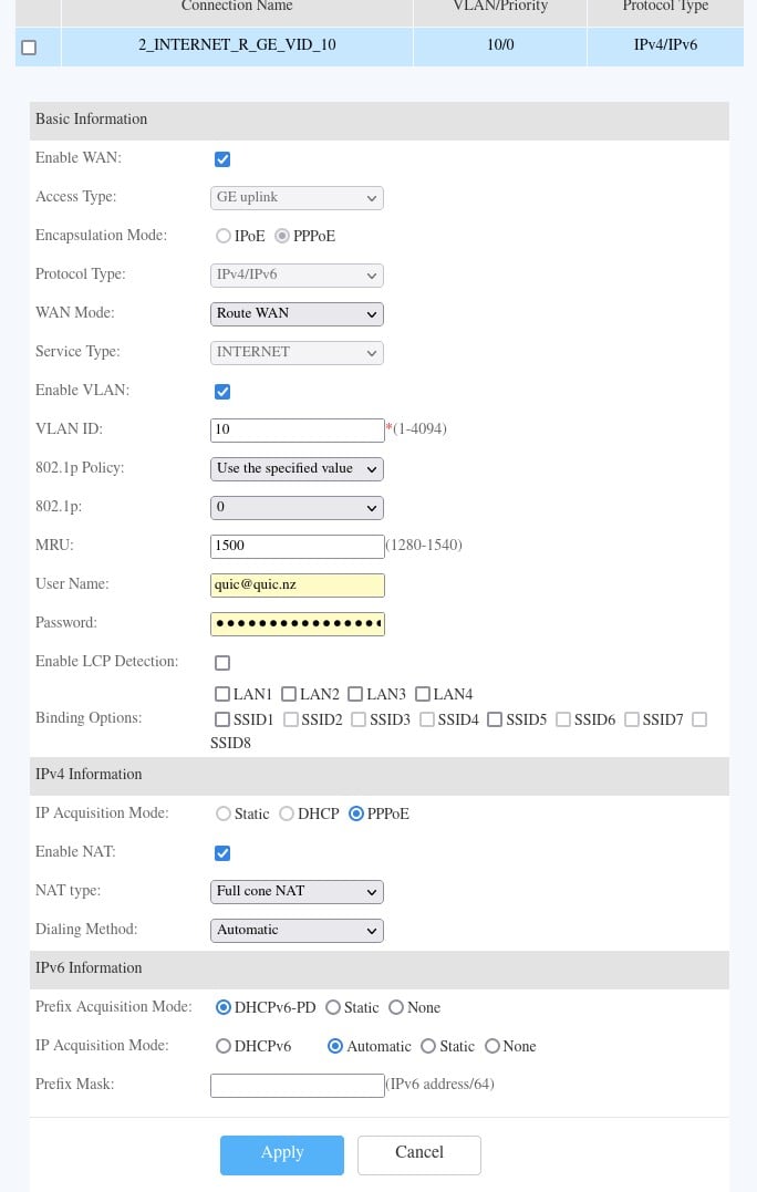 I thought I would be able just use the old settings with IPOE/DHCP in the modem with vlan10 tagging.