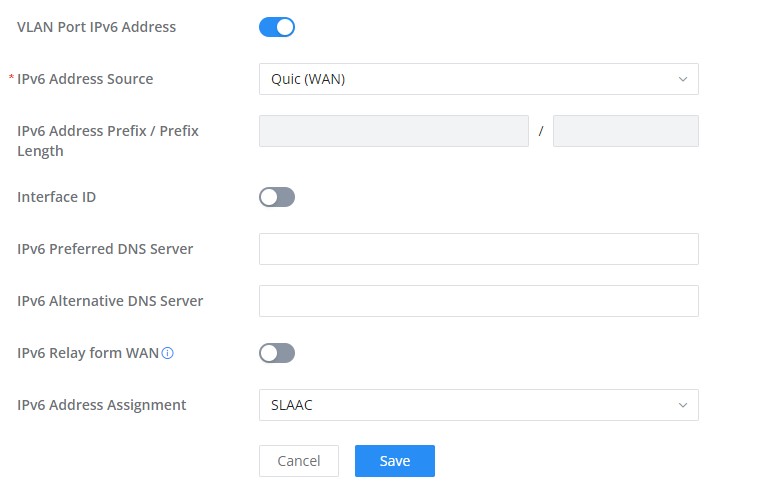 When I sent it to VLAN port IPv6 Address enabled it gives me the further options around IPV6 address assignment amongst others).