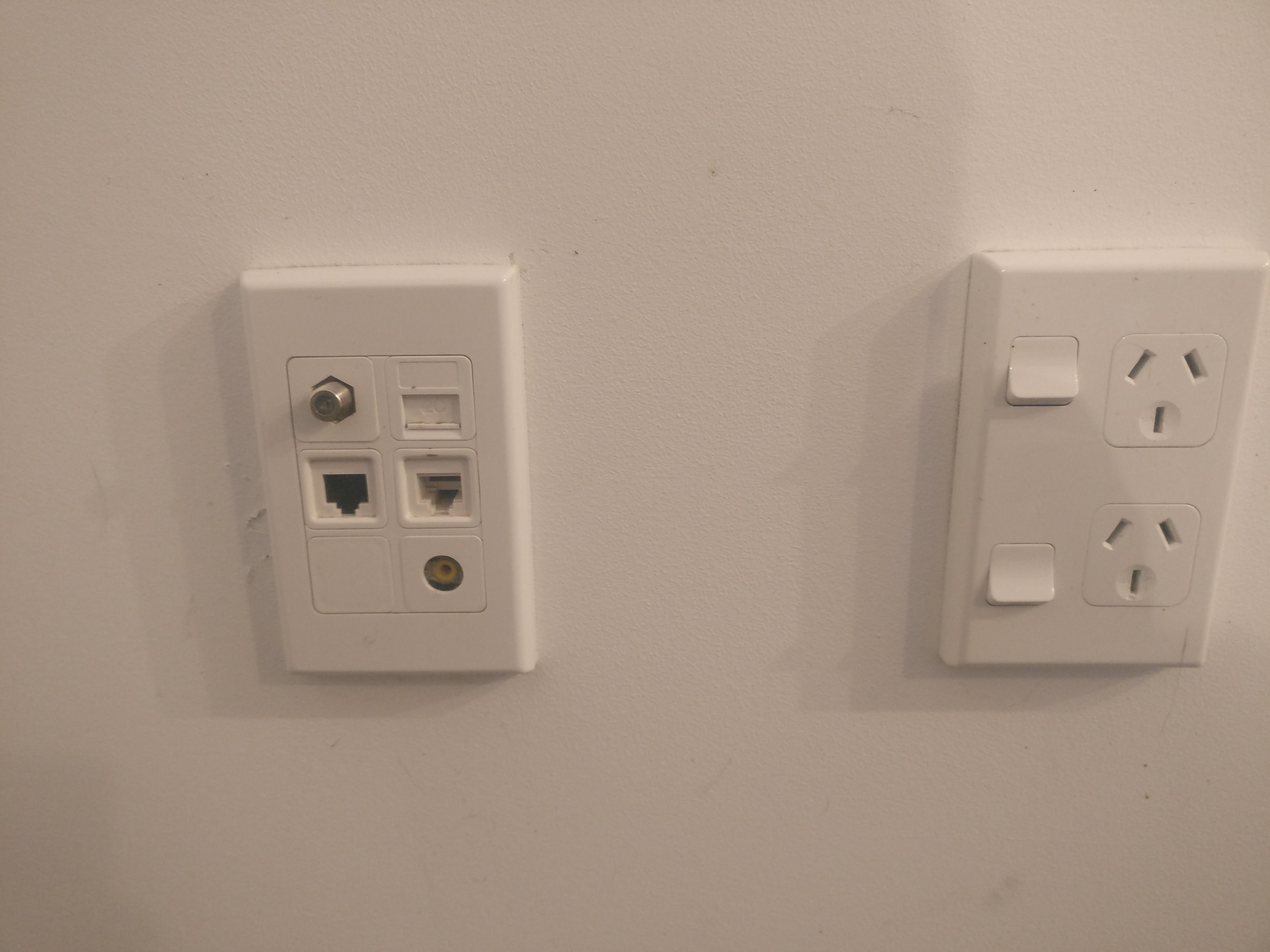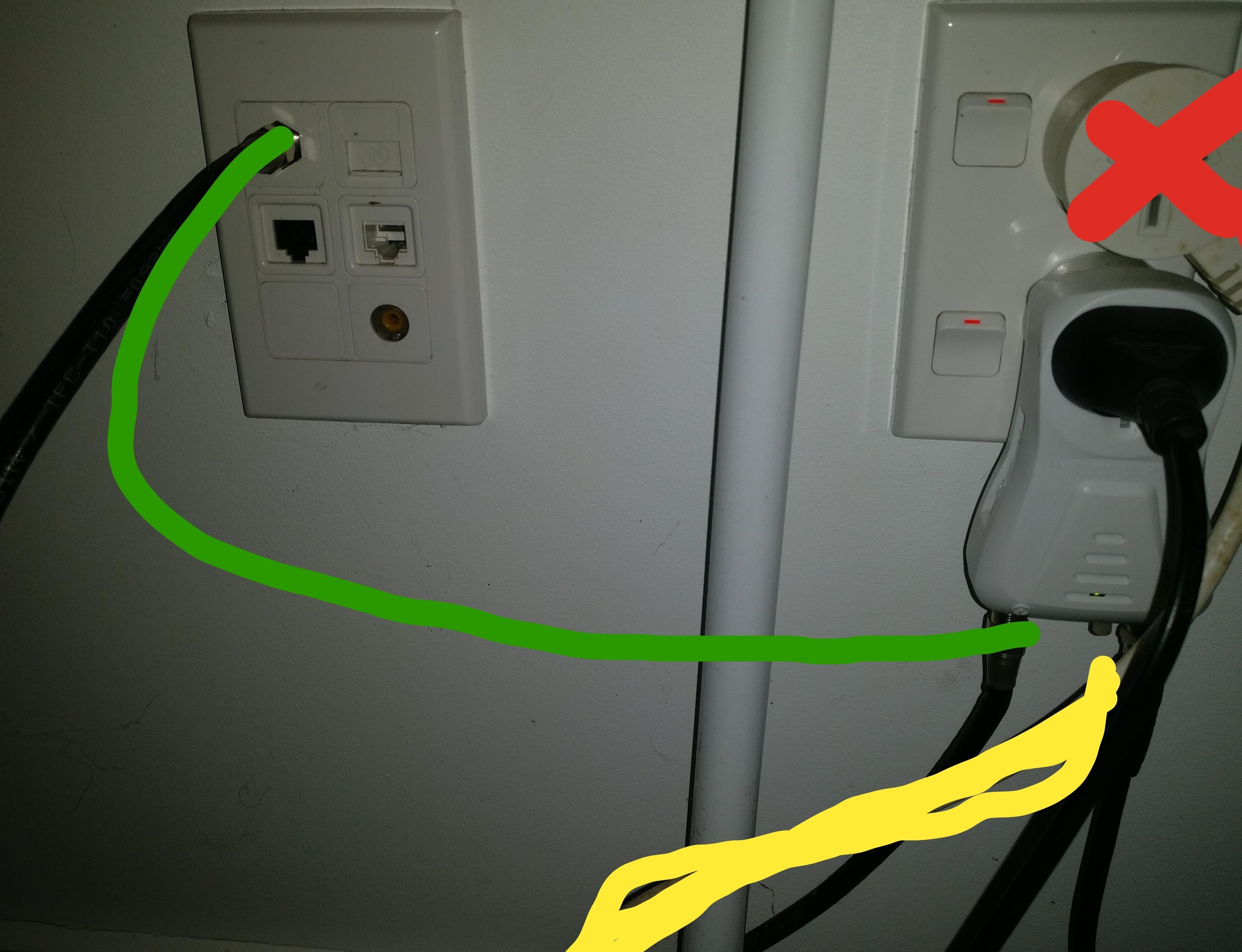 Her current setup includes the below picture. The "plugs/sockets" on the left, plus the general wall sockets on the right. On the top left of the left hand side there is a black cable which then joins up to the bottom left of the filter. On the right hand side of the filter, another cable joins up to the freeview box, I guess it acts as the "aerial"? I brought my TV over, and I plugged the cable on the right hand side (Which goes into her freeview box, yellow line below) into my TV, and got the FTA channels fine.
