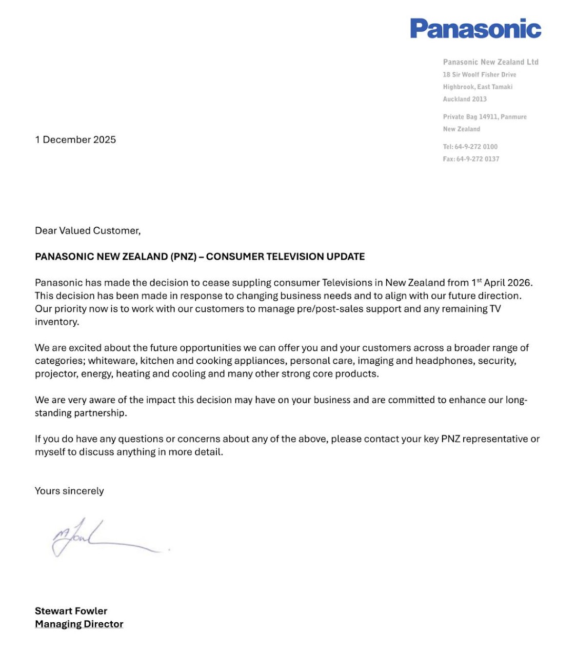 JB Hifi, Noel Leeming and Harvey Norman have all removed Panasonic TV's from their online sites