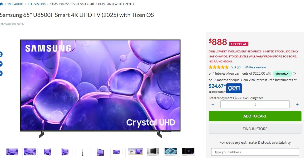 I noticed this weekend HN have a Samsung 65" U8500F Smart 4K UHD TV (2025) with Tizen OS for $888 which sounds incredibly well priced.