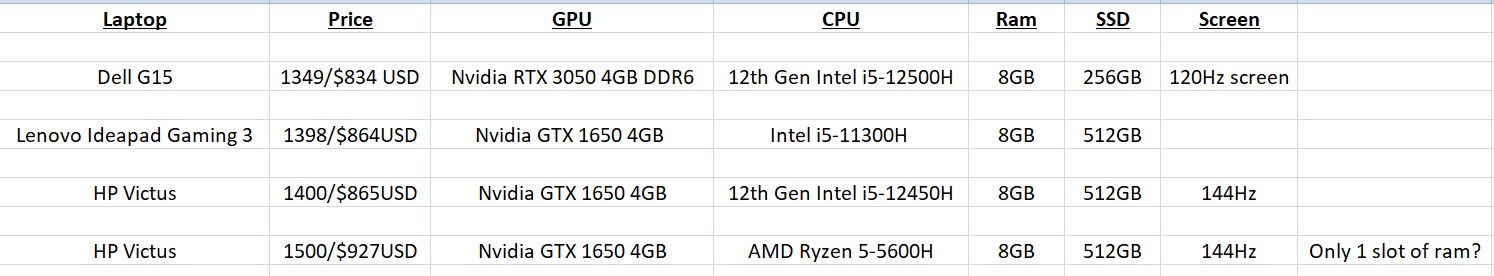 - Finally is this HP Victus from Noel Leeming at $1499, it's also available at Heathcotes for $1399 - It does "Only" have a GTX 1650, so again it's a step down in that department, but I really like the look and build of the Victus the most. The version from NL has an AMD Ryzen 5 5600H Processor, while the Heathcotes has 12th Generation Intel Core i5-12450H, I'm not sure which is better?