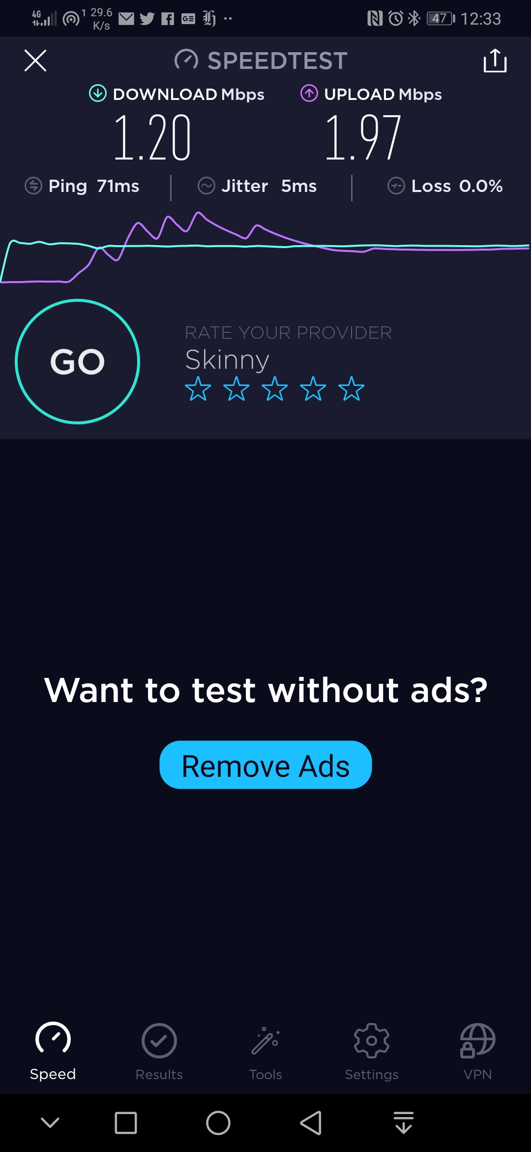 ok 1.2 down 2.0 up is better. i think it just couldn't play ball with the speedtest android app