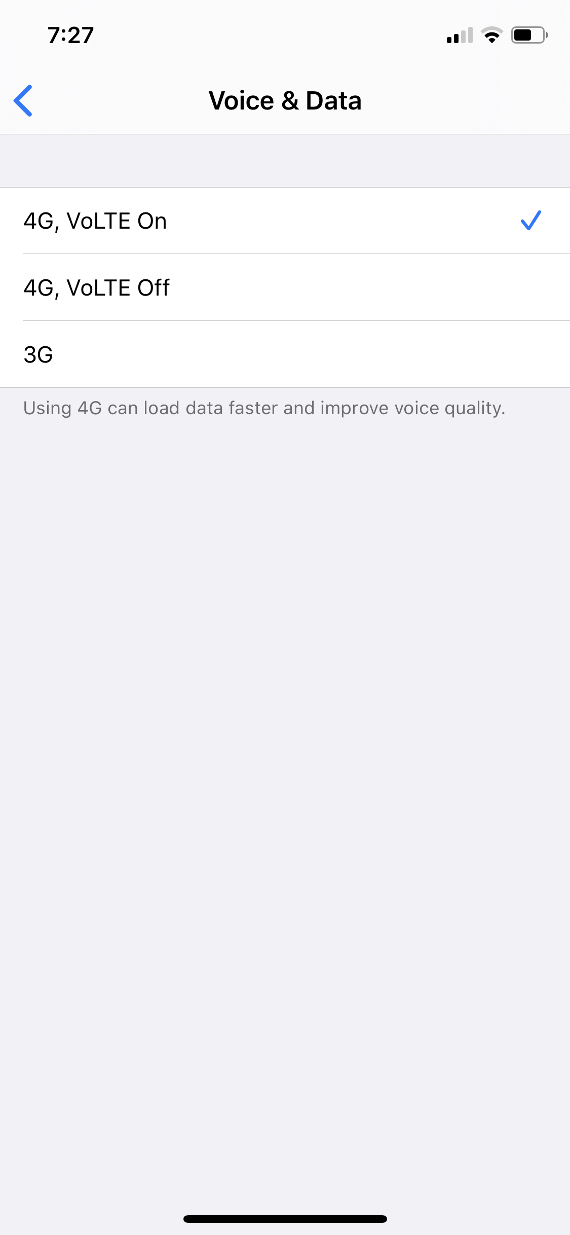 Turned on for my iPhone, Mobile > Mobile Data Options > Voice & Data > 4G, VoLTE On