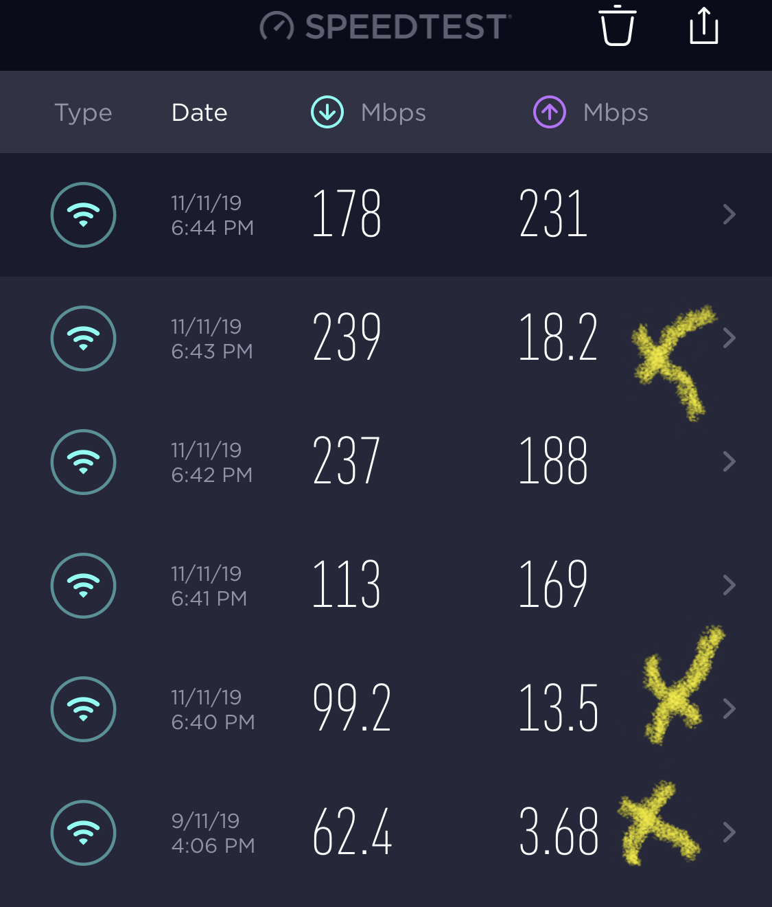 This screeen snip is from results taken today at 7.45am ish. The top and bottom results are Spark Wellington. The second one down is Wanna Internet in Hamilton, the next one down is Spark Auckland, the one below that is Spark ChCh, the one below that is ACSData Wellington. I've had the issue with tiny upload speeds with the Spark Wellington one since the weekend. The download speeds are not too different to usual, but I usually get between 25-48 Mbs upstream with Spark Wellington depending on day/time of day.