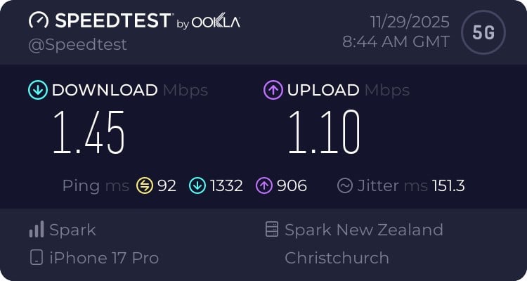 Just outside Chch, I get 80/40 on 4G (just now - I sometimes get over 100)