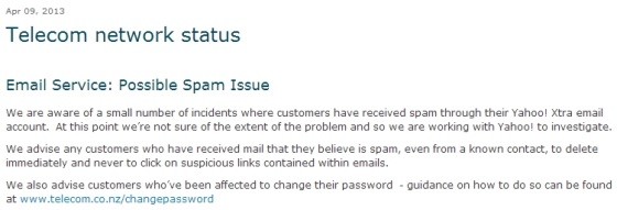 As we announced last Friday, Telecom is continuing to offer its Yahoo! Xtra email service with Yahoo! as our email provider, after receiving strong feedback from customers around the high value they place on the service, and obtaining a commitment from Yahoo! to work with Telecom to improve the customer experience and respond to security issues. In the last 24 hours we have seen this new commitment in action as both Telecom and Yahoo! have worked quickly to contain this latest incident.