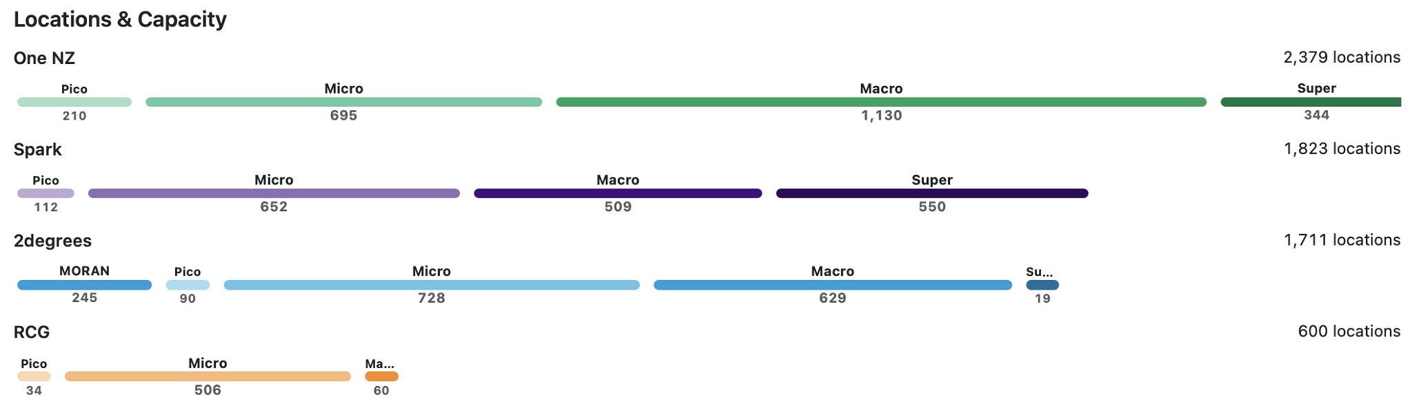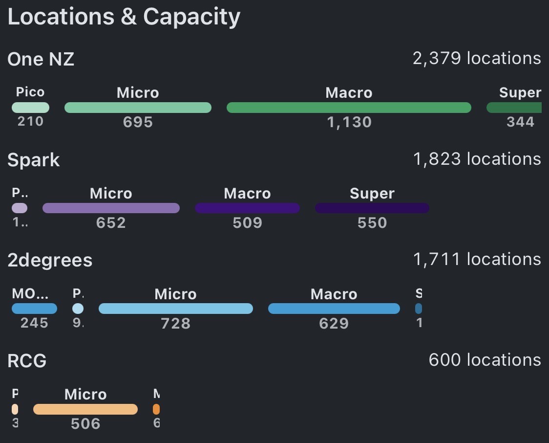 While the exact number of locations for One NZ remains unclear, 2degrees claims to have 2225 locations while Spark claims 2262 officially. Both providers appear to include RCG (rural) locations, which are common to all carriers, which I have broken out separately.