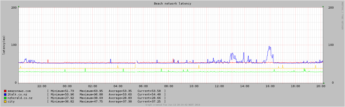 Latency pretty much the same for beach connection, presumably all traffic still via Auckland, except for 2talk which had challenges during the day, but Spark fibre in the city also had challenges to 2talk throughout the day. Spark DNS not yet available on BigPipe connection. I'm guessing our beach ADSL2 connection is in with Wellington 25/6 for the exciting big BigPipe latency improvements?