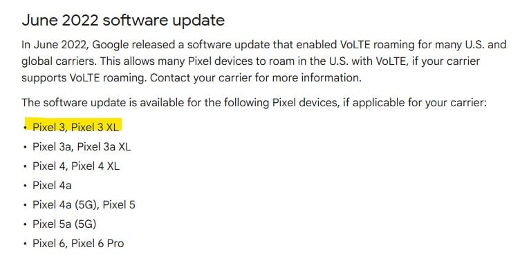 The issue is that Pixel 3 updates ended in October 2021, before the June 2022 update needed for VoLTE.