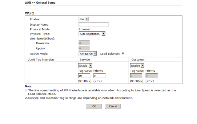 VLAN tag insertion is set to 10 but on the Service side, perhaps this should be the Customer side? The router does not connect if both are set to zero.