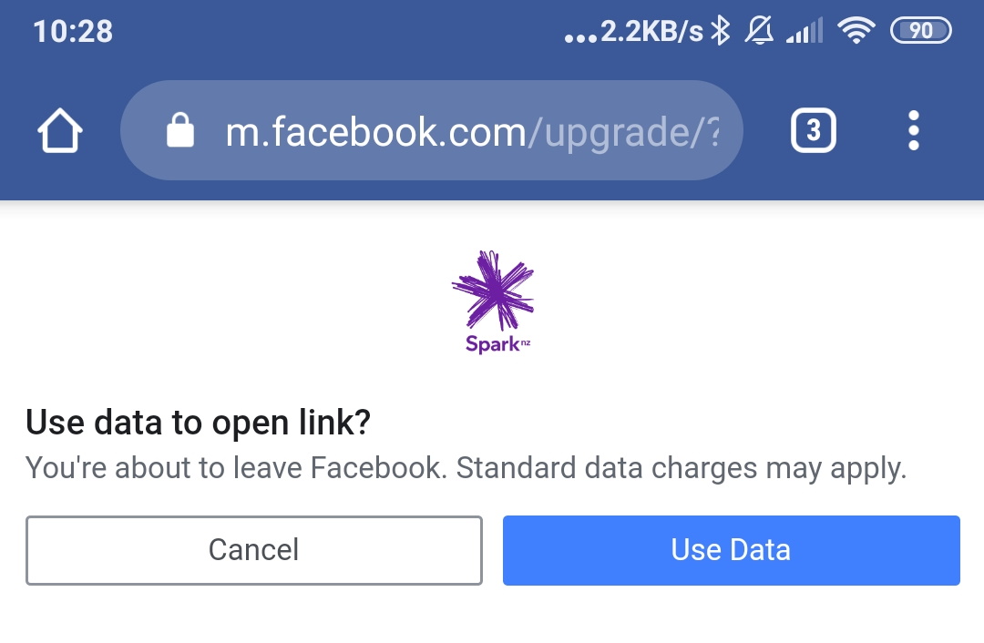 That shows up because some providers allow social data to be free, like if you have a Social Data Pack. So that message is to make sure you're aware that if you follow the link, you'll then be using your actual data rather than the free data. Pretty sure it's baked into the software and can't be disabled but if you get on a chat with Spark they might have a way. Alternatively just don't use the social data pack depending on how much your actual data bundle is.