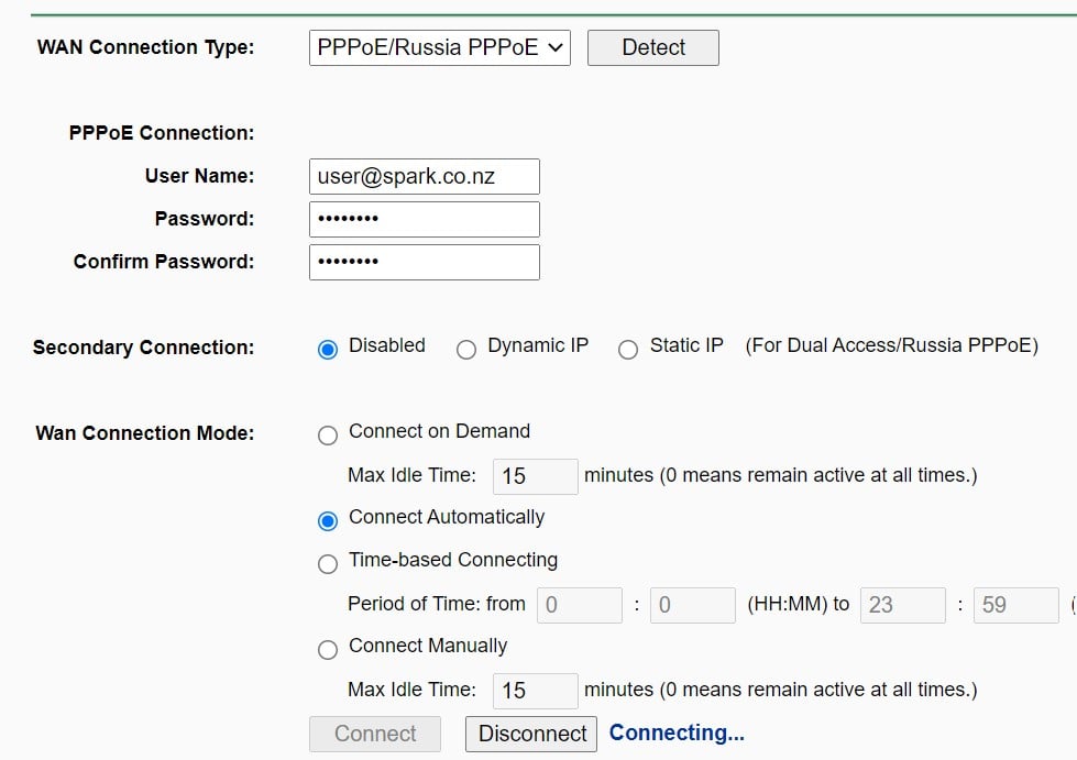 My ISP for my fibre connection was changed from Bigpipe to Spark this morning - no Internet access since. Spark are reporting the change-over has been made, and no faults. Can someone run their eye over my TP-Link router WAN connection details (attached) and confirm they are correct or not. I believe they are correct sourced from the Spark web site (PPPoE). If I run a "detect" connection type it reports "Static IP".