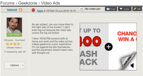 I have 1024x768 screens both at home and work and the video ad box makes geekzone a poor experience. I'm not against the ads themselves, just the placement doesn't seem very well thought out.