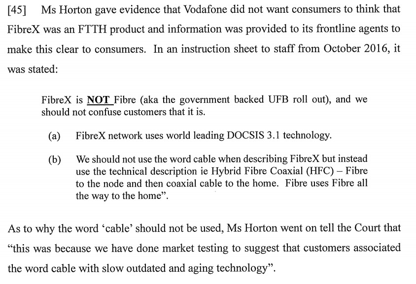 Vodafone completely failed the "reasonable person" test - what would a "typical" consumer in NZ understand FibreXYZ to be? Fibre has a meaning in the NZ market and it isn't HFC. FibreX was a deliberate attempt to obfuscate the truth and they got slapped for it. The decision is entirely reasonable in law and in principle.