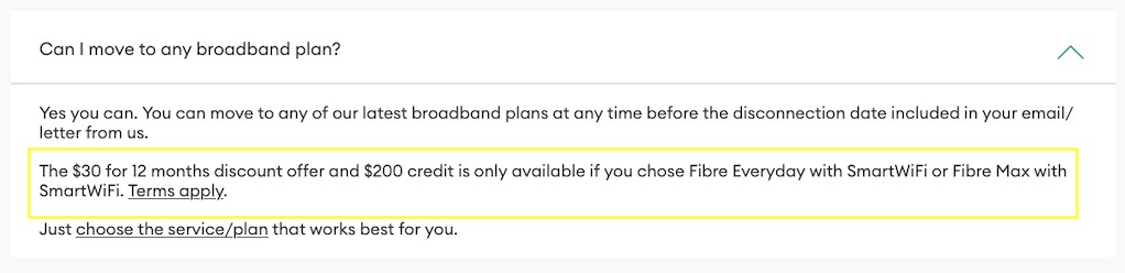 The webpage indicates their Fibre Max plan is eligible for the same $30 discount & $200 credit offer.