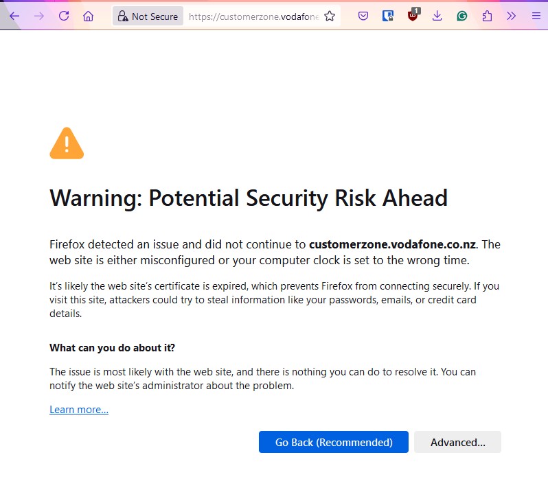 As per https://www.sslshopper.com/ssl-checker.html#hostname=customerzone.vodafone.co.nz (my mother-in-law raised it with JM via chat with Hana but the agent kept circling back to blame it on the local device's certificate store if someone with One wants to check up on that).