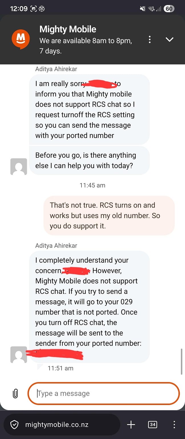 I contacted MM and they are claiming that they don't support RCS (see below), even though when I turn RCS on it does work (but has the wrong number). I also don't see how Mighty can not support it when another One NZ MVNO (Contact) does!