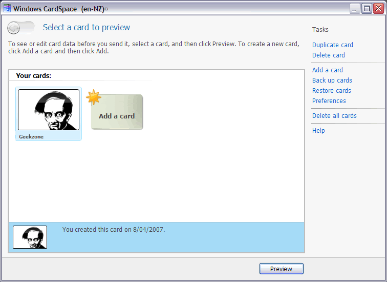 I recently downloaded .NET Framework 3.0, which appears to have added Windows CardSpace to my XP Control Panel. From what I can tell, this is a digital identity card tool to help authenticate the users with websites (see quick explanation).