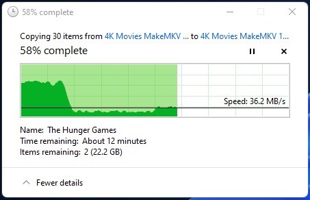 Wondering if anyone might have any idea why copying between these two drives has decided to slow down so much. It was fine earlier in the day then it decided to slow down a lot. I could only get it to go as fast at the beginning of the screenshot by completely turning of the pc for half an hour. Its Windows 11, internal drive to external drive.