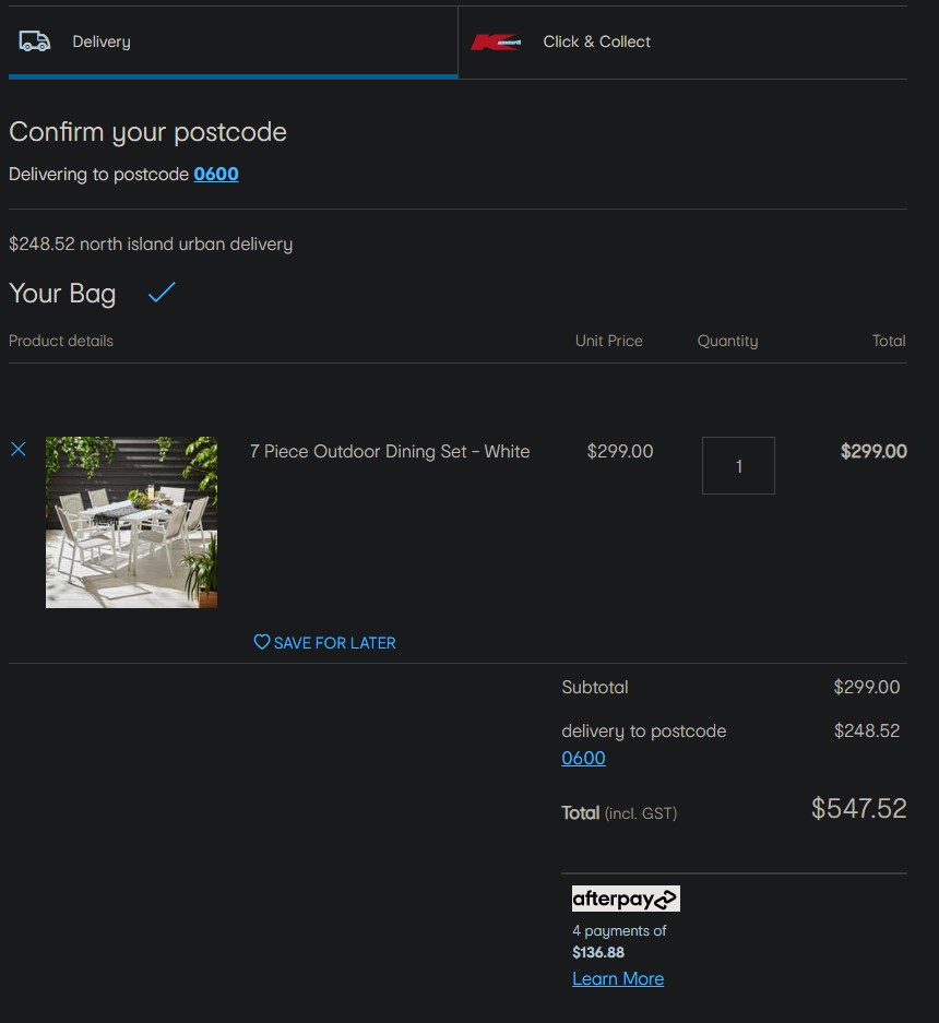 Almost as bad as Bunnings wanting $150 to deliver two bits of plastic.
