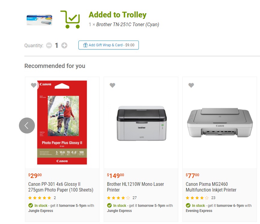 Put a colour laser printer toner cartridge in the shopping basket and get recommended I buy inkjet paper, a black and white laser printer, and an inkjet printer.
